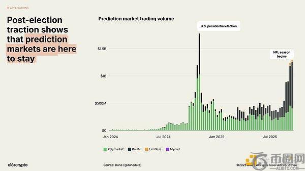 预测市场在2024年美国总统大选周期突破主流圈层,头部平台Polymarket和Kalshi月交易总量达数十亿美元。尽管曾面临"非选举年能否维持活跃度"的质疑,这些平台2025年初以来交易量增长近5倍,已逼近历史峰值。