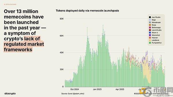 在缺乏明确监管的环境下,Memecoin呈现爆发式增长,过去一年问世的数量超1300万种。随着良性政策与两党立法为更具建设性的区块链用例扫清障碍,这一趋势近几个月有所降温——9月发行量较1月下降56%。