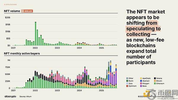 NFT市场交易量虽未重返2022年峰值,但月活跃买家数量持续增长。这些趋势似乎预示着消费者行为正从投机转向收藏,而Solana、Base等链上更低廉的区块空间成本为此提供了条件。
