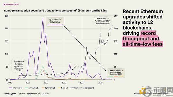 以太坊持续推进其扩容路线图,大部分经济活动已迁移至Arbitrum、Base和Optimism等第二层解决方案。L2的平均交易成本从2021年的约24美元降至如今的不到一美分,使得与以太坊相关的区块空间既廉价又充足。