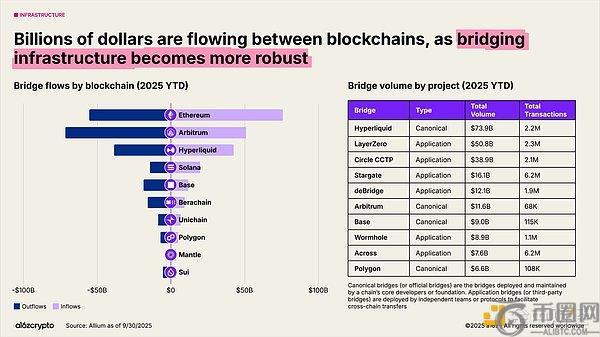 跨链桥正实现区块链互操作性。LayerZero和Circle的跨链传输协议等解决方案使用户能在多链系统中转移资产。Hyperliquid的规范桥年初至今交易量已达740亿美元。