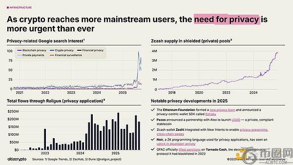 隐私保护正重回焦点,并可能成为大规模应用的前提条件。关注度上升的迹象包括:2025年与加密隐私相关的谷歌搜索量激增;Zcash的屏蔽资金池供应量增长至近400万ZEC;Railgun的月交易流量突破2亿美元。