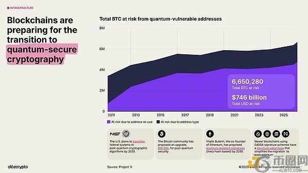 与此同时,区块链正在加速推进抗量子计算路线图。目前约有7500亿美元的比特币存放在易受未来量子攻击的地址中。美国政府计划在2035年前将联邦系统过渡至抗量子密码算法。