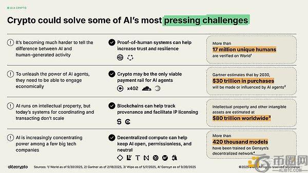 在众多科技进步中,2022年ChatGPT的推出将AI推向公众视野焦点——这也为加密领域带来明确机遇。从追溯溯源与IP授权到为智能体提供支付通道,加密技术可能成为解决AI领域最紧迫挑战的答案。