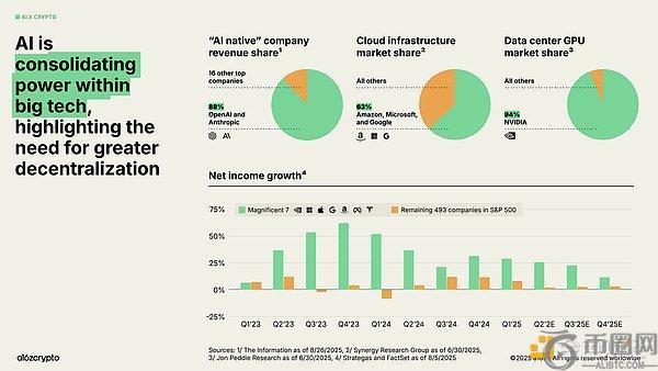 与此同时,人工智能的计算层正围绕少数科技巨头整合,引发了对中心化与审查的担忧。目前仅OpenAI和Anthropic两家公司就掌控了88%的"AI原生"企业收入,亚马逊、微软和谷歌占据云基础设施市场63%的份额,而英伟达则持有数据中心GPU市场94%的份额。这种失衡使得"七巨头"公司连续多个季度实现两位数净利润增长,而标普500其余493家企业的盈利增长总体未能跑赢通胀。
