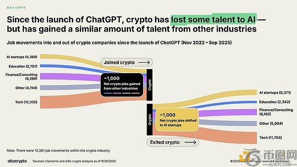 在AI热潮中,部分加密建设者已转向。我们的分析显示,自ChatGPT发布以来约有1000个工作岗位从加密行业流向AI领域。但这一流失已被来自传统金融、科技等其他领域加入加密行业的同等数量建设者所抵消。