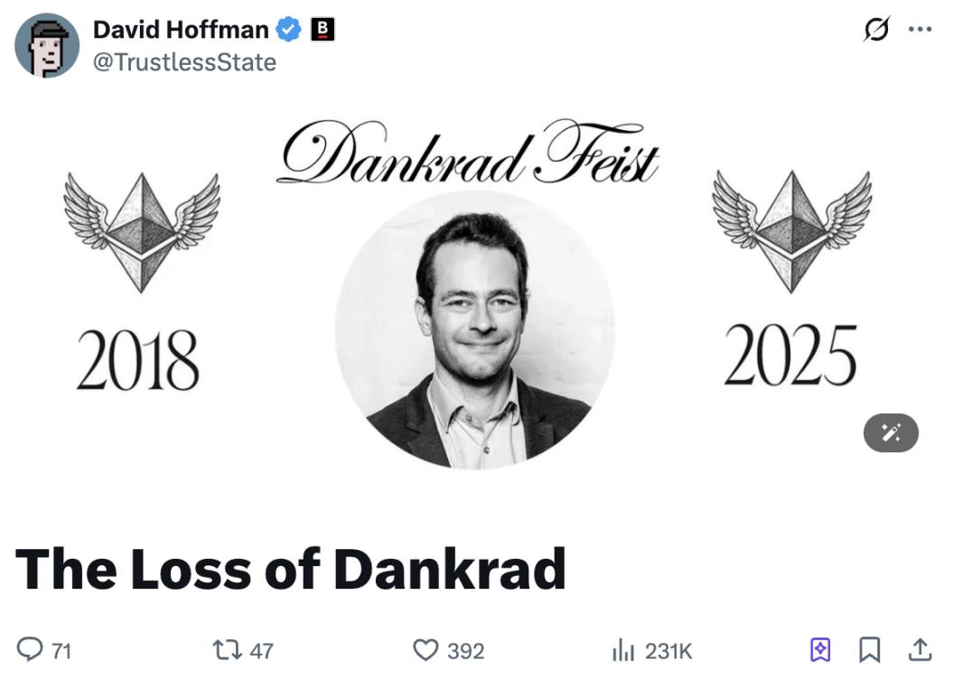 东八区 19 日晚间,Bankless 联创 David Hoffman 在 X 上发文「悼念」在职时间最长的以太坊基金会研究员 Dankrad Feist 选择离开以太坊,加入稳定币 L1 Tempo。