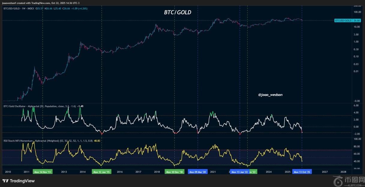 比特币/黄金图表中可以看到更有趣的趋势,该图表显示比特币兑黄金继续上涨,在过去 24 小时内上涨了 8%。
