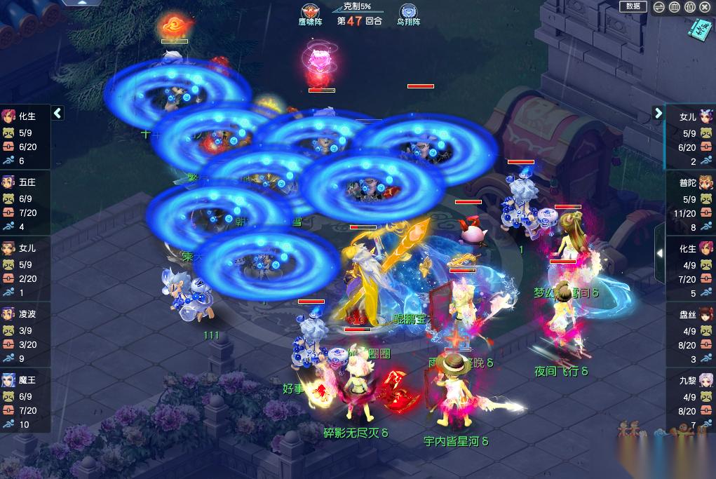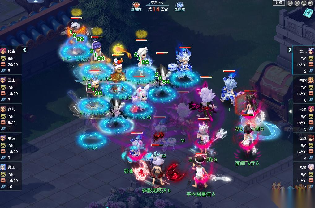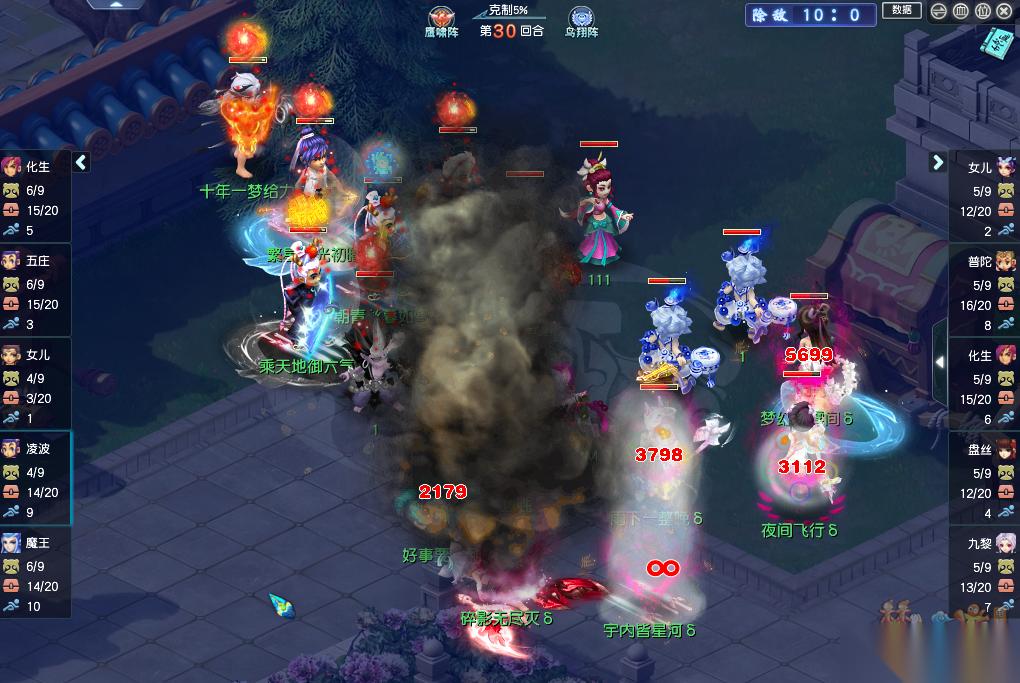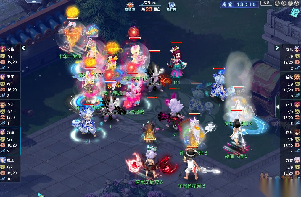 【夫子庙】以凌波城+魔王寨构建的双输出拥有无与伦比的清宠效率,仅仅23回合,就已经击飞了对手的15只召唤兽,让【曲阜孔庙】只能以血宠应战,更不敢贸然召唤谛听。