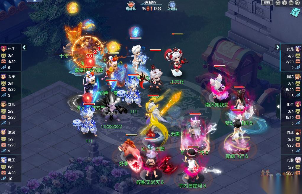 第61回合,【曲阜孔庙】的普陀山触发奇袭技能,他们果断抓住这个机会,朝【夫子庙】的化生寺发动点杀,噬魔神壶+巨岩破+巨岩破+相灭相生,瞬间就将化生寺击倒在地。此时【夫子庙】全队仅剩12个药品,一旦有人物倒地将再难恢复安全血量。