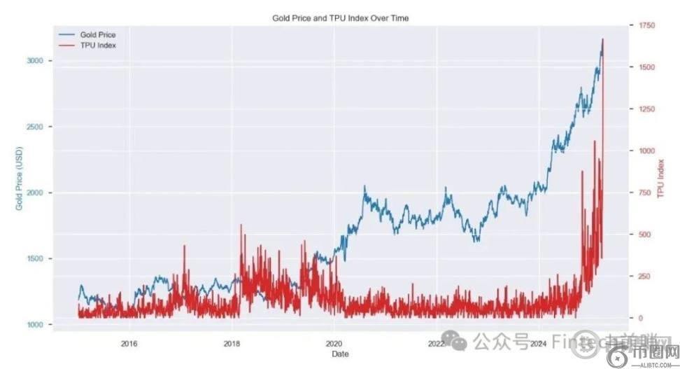 例如,美国债务迅速上升引发美元长远价值担忧,黄金可以在此类极端情境下充当」盾牌「。其次,在地缘政治冲突方面,黄金被视为动荡时期的安全港。每当发生战争或国际关系紧张,如 2018 年中美贸易战、2022 年俄乌战争、2025 年美国关税冲击,避险资金往往流入黄金推动金价上涨。经济历史回测研究也显示了近十年黄金价格和贸易政策不确定性(Trade Policy Uncertainty Index)之间的正向」幂律「关系: