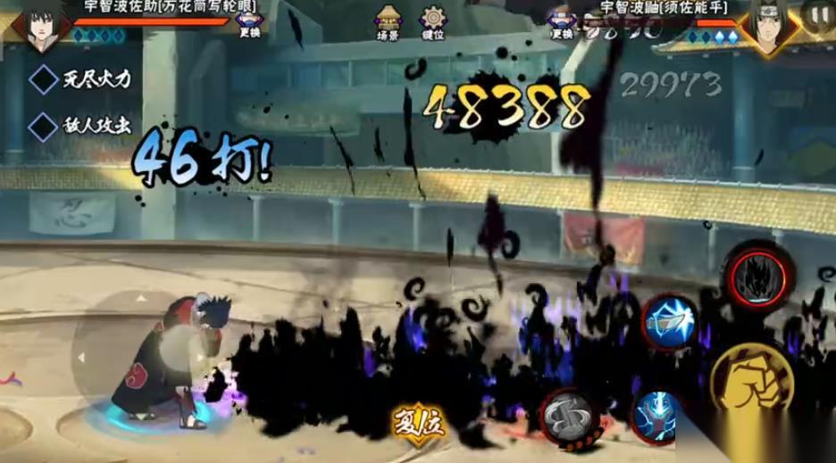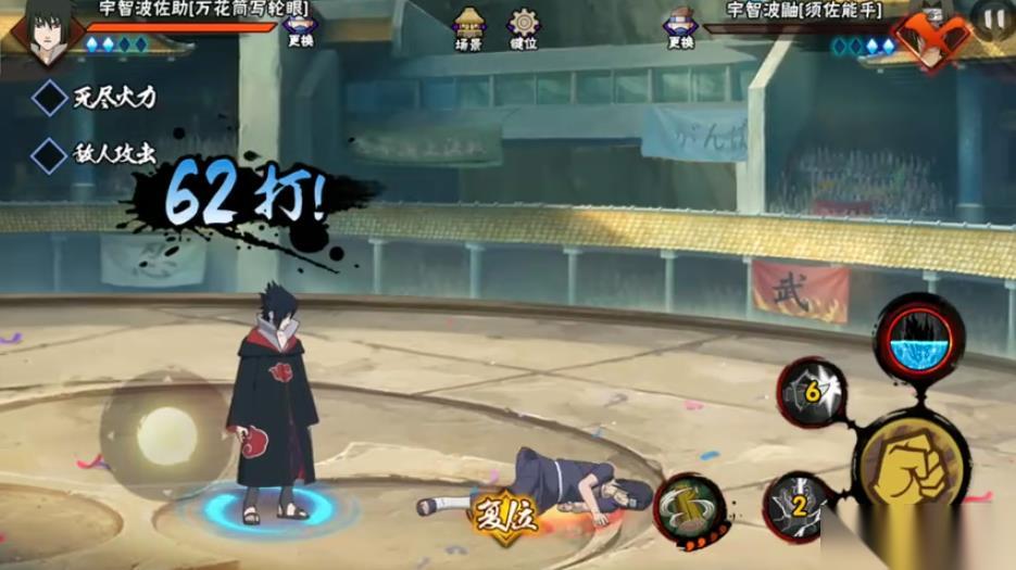 大招是释放出幻术将敌人陷入到幻境里,再用天照黑焰造成持续伤害,可以立即抓取住敌人,大招能稳定衔接二技能,也可以接上组合技。当我们从右边往左边释放大招时还能衔接普攻,而从左边往右边释放大招时则无法衔接普攻。佐助还能用奥义技能蹭能量豆,当我们将敌人打至浮空到一定高度时,利用二技能三段划开便能立刻释放出大招。