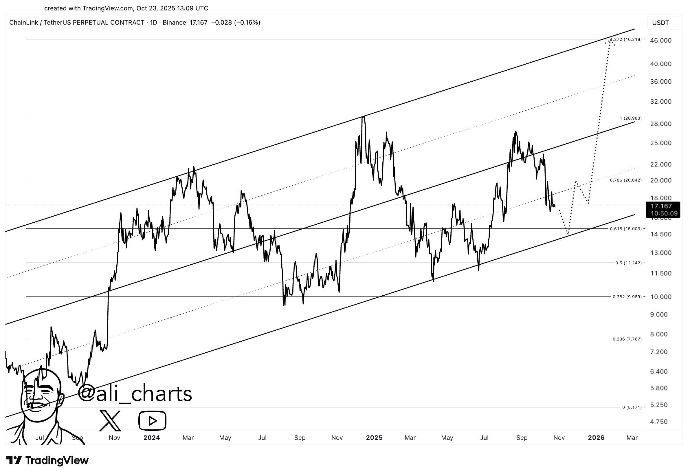 马丁内斯预计,LINK 将重新回到通道下边界,完成持续下跌,其中 15.00 美元区域(与 0.618 斐波那契回撤位一致)将成为关键关注区域。该分析师认为 15.00 美元是一个强劲的吸筹区域,建议投资者考虑在该水平买入。预计 LINK 将由此开始反弹,并朝着通道上边界迈进。