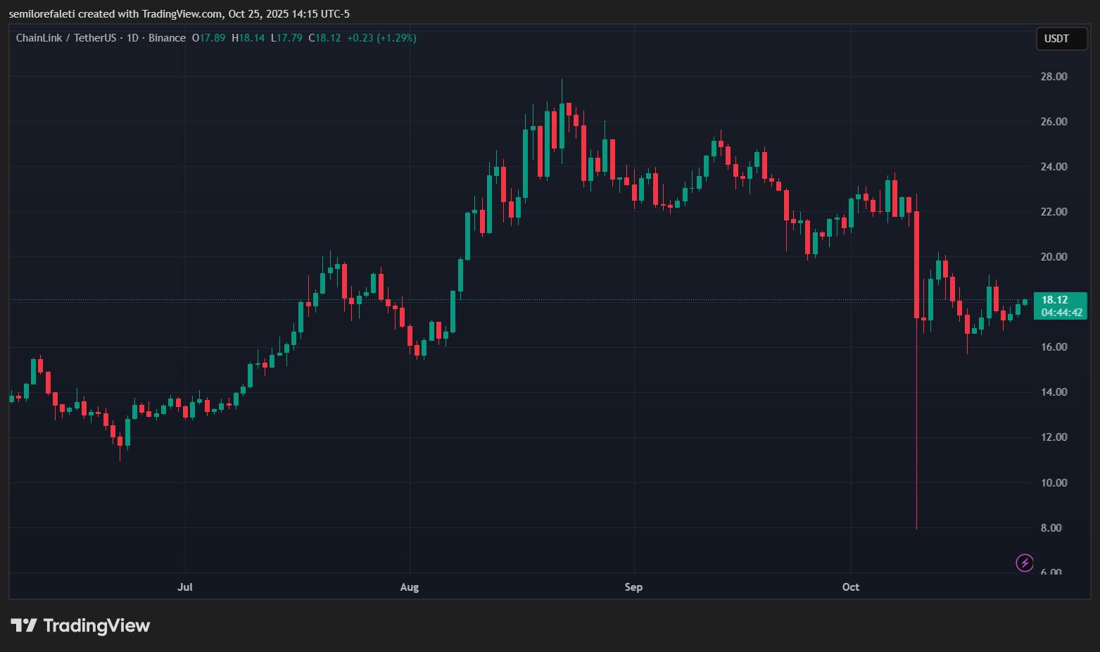 根据马丁内斯提供的图表分析,LINK 交易于一个宽幅上升平行通道内,该通道自 2023 年中期以来一直主导着其市场走势。值得注意的是,该上一次从该通道下限反弹是在 2025 年 6 月,交易价格最高达到 28.00 美元,随后回落至当前 18.00 美元左右的市场价格。
