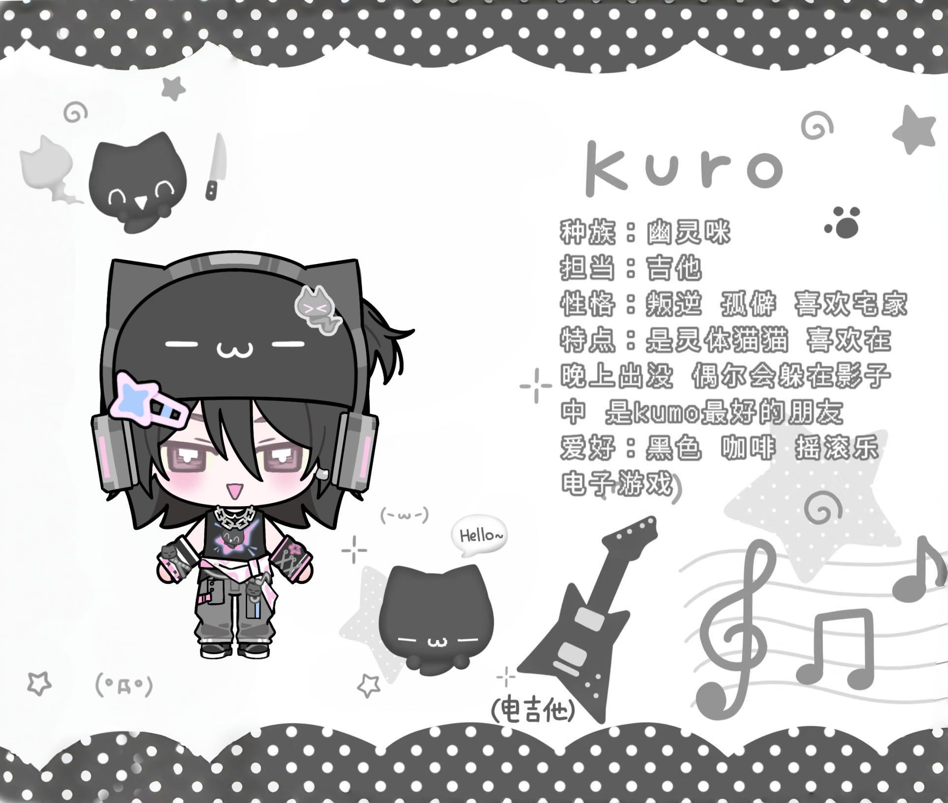 Kuro原本来自音符布丁的世界,是一只热爱夜晚与音乐的幽灵猫。