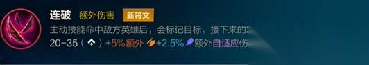 主动技能命中敌方英雄后,会标记目标,接下来的2次普攻或主动技能附带(20~35+5%额外攻击力+2.5%法术强度)额外自适应伤害。(冷却时间15秒)