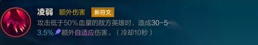 攻击低于50%血量的敌方英雄时,造成(30~50+7.5%额外攻击力+3.5%额外法术强度)额外自适应伤害。(冷却时间10秒)