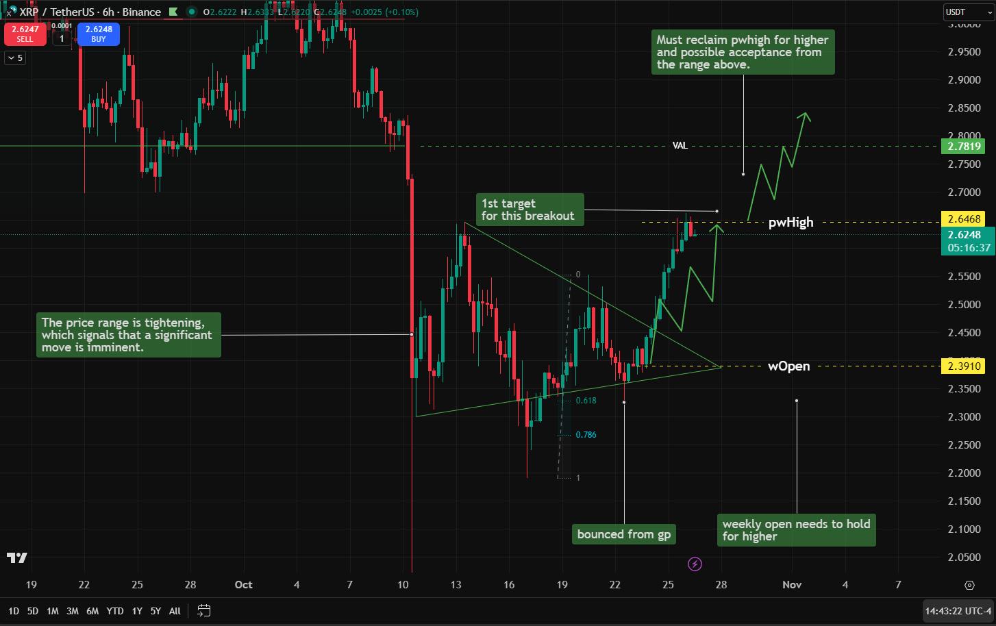 Carl 的图表显示,XRP 已突破币安 6 小时图上的楔形形态,预示着动能转换。他预测,如果 XRP 收于 2.65 美元的关键阻力位上方,则可能迈向下一个目标区域 2.78 美元至 2.90 美元之间,并可能测试 3 美元。