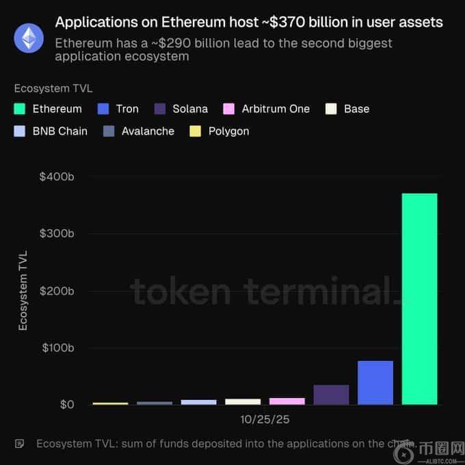 以太坊目前以超过 3700 亿美元的用户资产锁定量位居首位,比排名第二的区块链高出约 2900 亿美元。