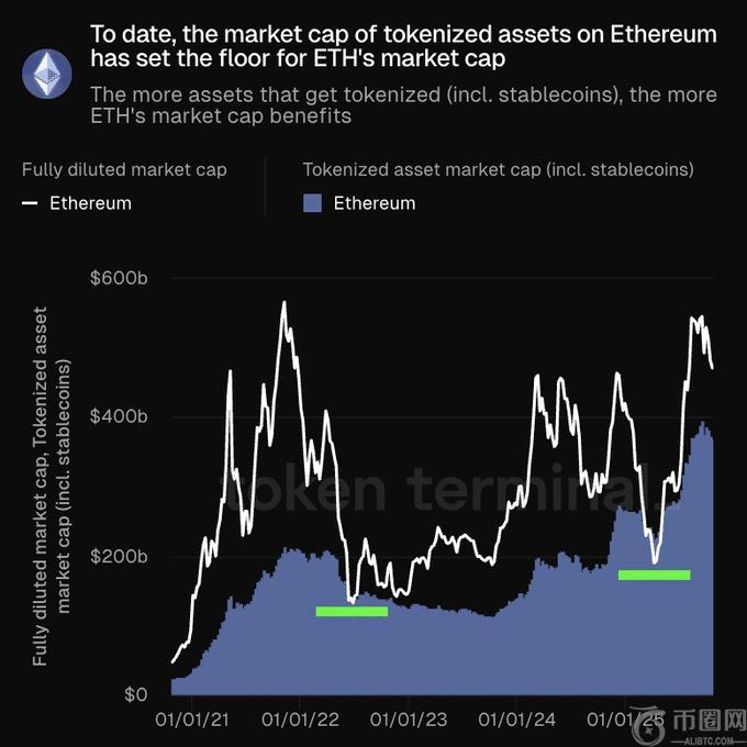 数据显示,以太坊上代币化资产(包括稳定币)的市值通常会为 ETH 的整体价值设定下限。随着越来越多的资产在链上发行和交易,以太坊的市值也随之上升。