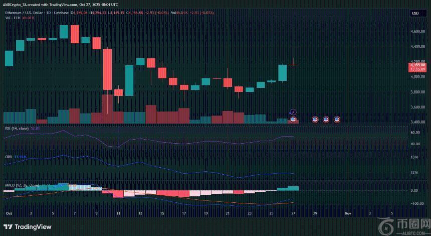 截至发稿时,ETH在短暂试探 4,200 美元附近的阻力位后,目前交易价格为 4,155 美元。