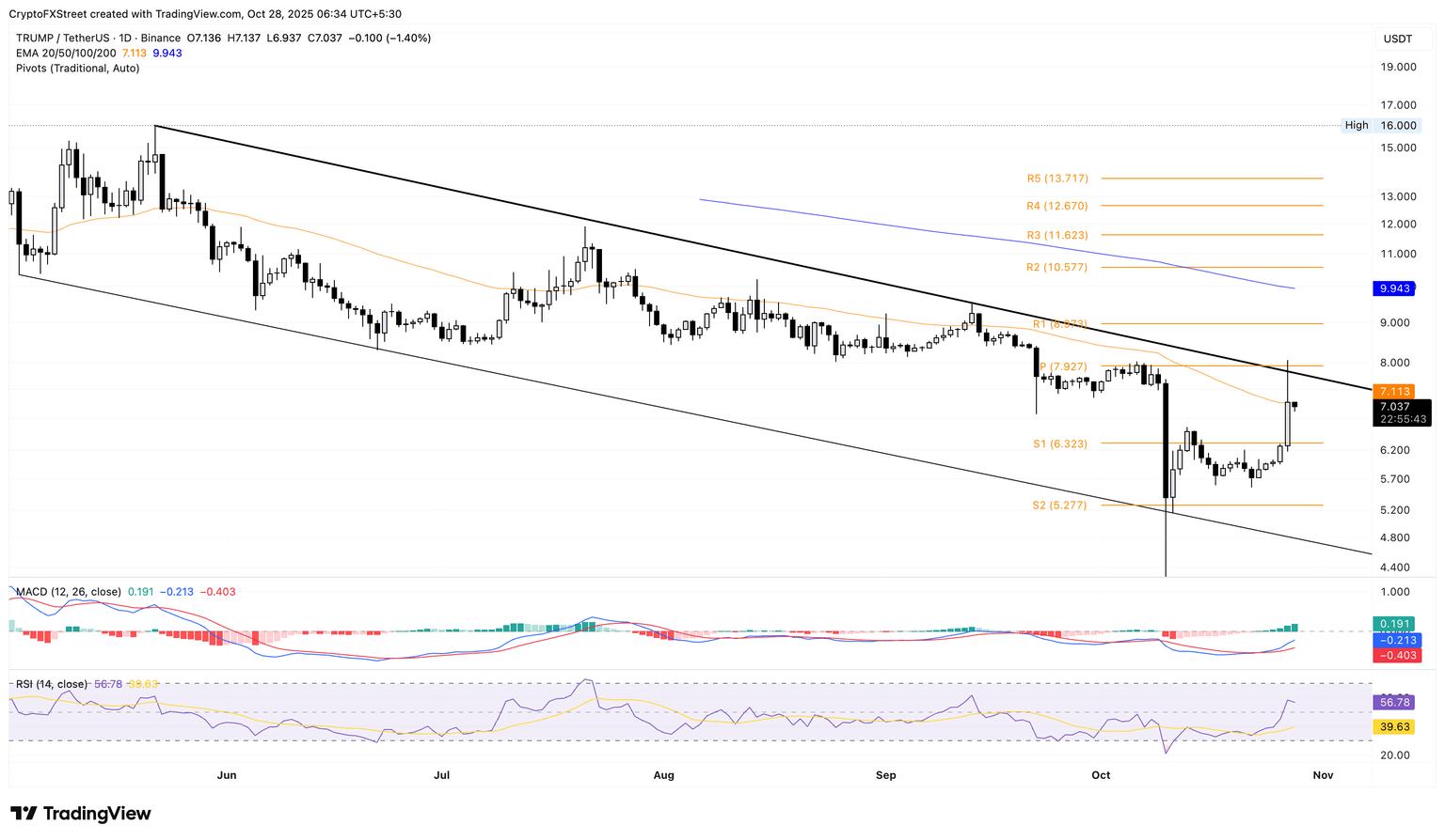 另一方面,TRUMP 代币的关键支撑位仍然在 S1 枢轴点 6.323 美元。