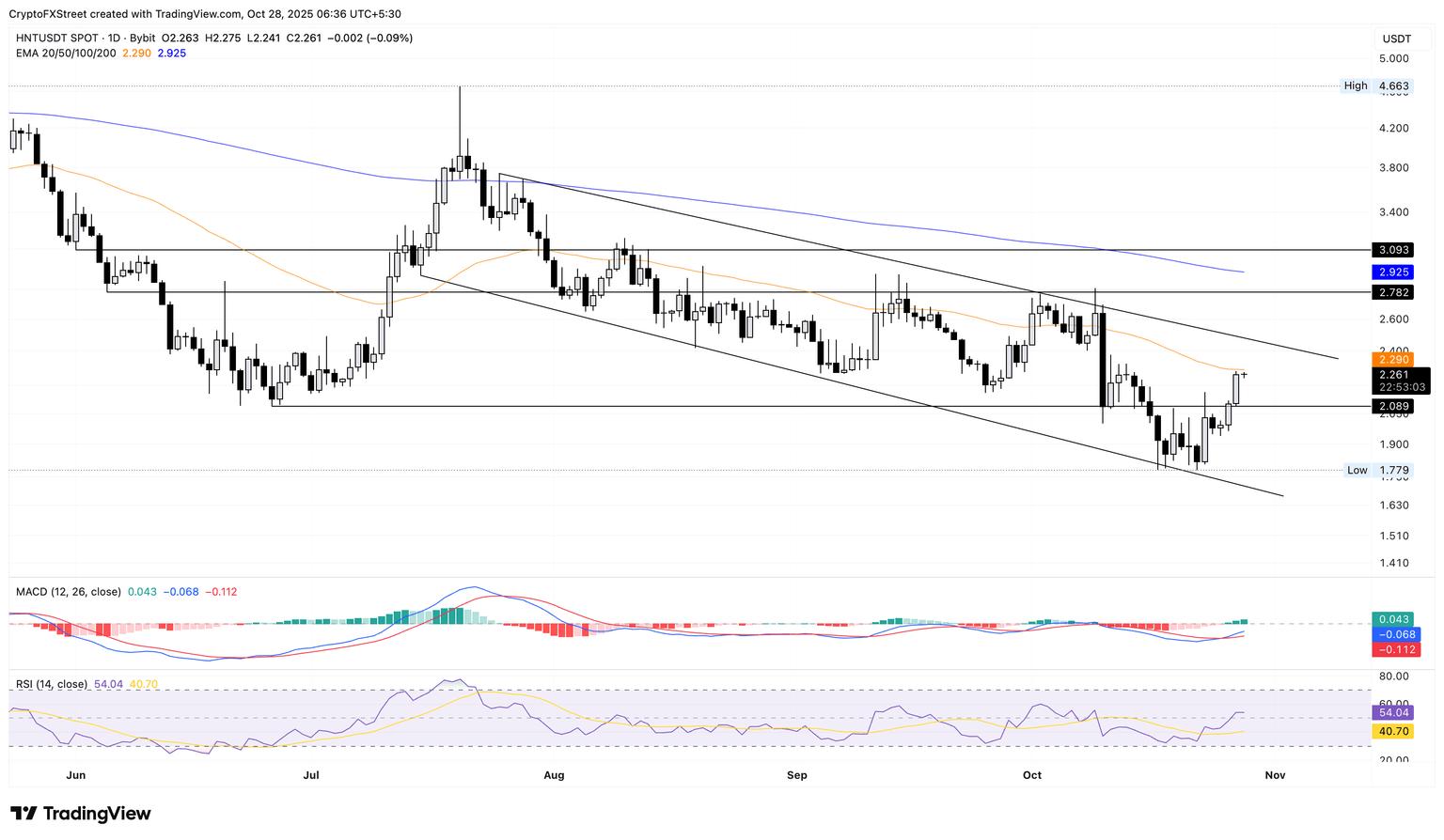 截至周二撰写本文时,氦气交易价格高于 2.250 美元,较前一交易日上涨 7.66% 后保持稳定。与 TRUMP 类似,去中心化物理基础设施网络 (DePIN) 代币在 50 日均线 2.290 美元处面临阻力,处于下降通道形态中。