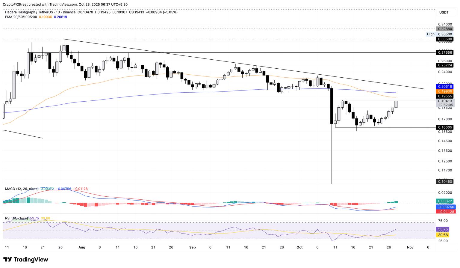 如果 HBAR 从 0.1955 美元反转,它可能会重新测试 10 月 11 日低点 0.1600 美元的支撑位。