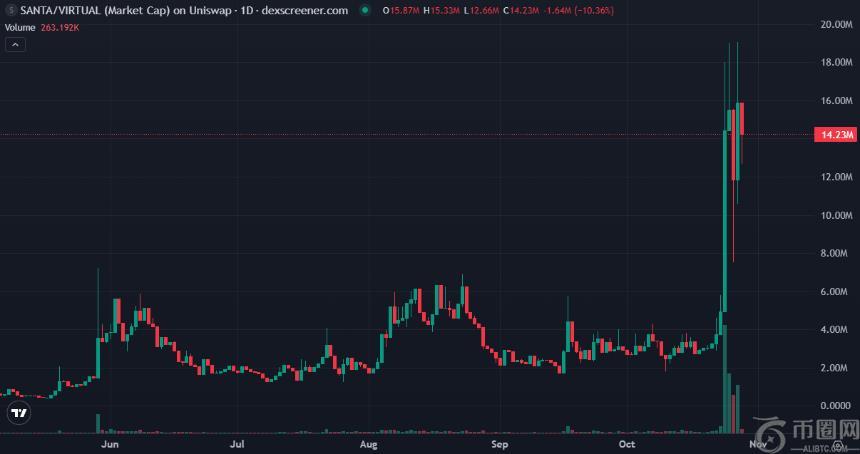 当前市值:SANTA 市值近日一度触及 1800 万美元,暂报 1400 万美元。