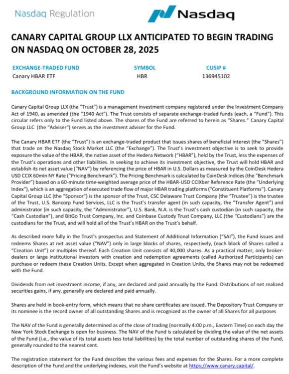 首只金丝雀 HBAR ETF 在纳斯达克的推出引起了大量投资者的兴趣。