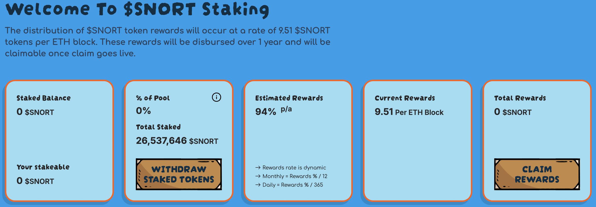 SNORT 投资者也可以质押其持有的代币,目前已有超过 2650 万个代币被锁定,继上周销毁 50% 之后,流通供应量从剩余的 2.5 亿个代币供应量进一步减少了 10% 以上。