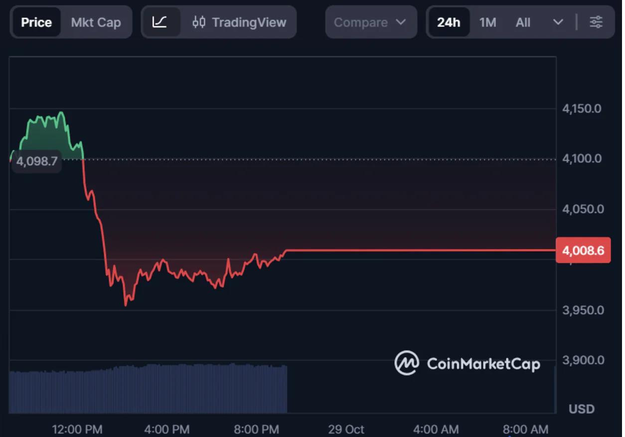 自2025年8月创下4953.73美元的历史新高以来,以太坊一直保持强势。截至2025年10月,ETH交易价格接近4008美元,并在2906美元附近获得稳固支撑。技术指标显示,在强劲上涨之后,以太坊价格进入盘整阶段,上升三角形形态预示着年底前可能出现另一轮上涨突破。