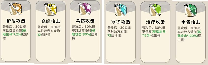 (1)触发类buff技能,普攻后概率增加护盾、能量、易伤、冰冻、恢复、中毒。主攻击流派回能点满,其他流派点一星即可。