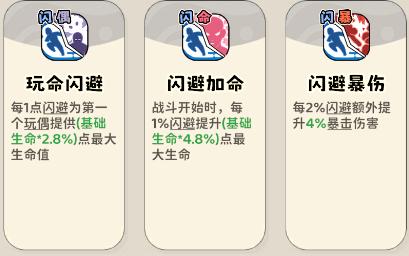 (2)提升属性类技能,闪避提高生命、玩偶生命、暴击伤害。数值比较高,可以点满使用。