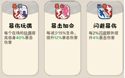 (2)提升属性类技能,闪避、在场玩偶数量、减少生命都可以提供暴击伤害。玩偶和闪避提供的暴伤很高。