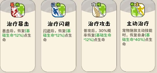 (1)触发类恢复技能,普攻、暴击、闪避、宠物释放主动技能后恢复生命。一级即可。