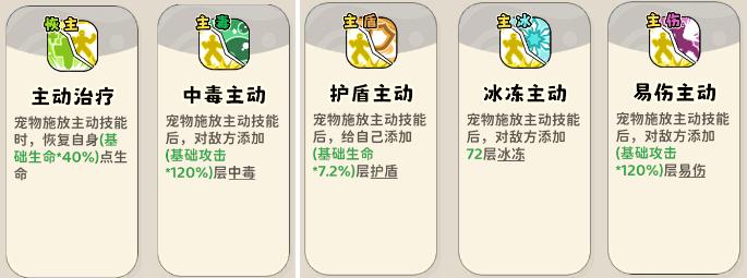 (2)宠物技能触发buff类技能,宠物释放主动技能后添加恢复、中毒、护盾、冰冻、易伤。因为主动流宠物技能释放频繁,先点一级后,都可以选择点满。