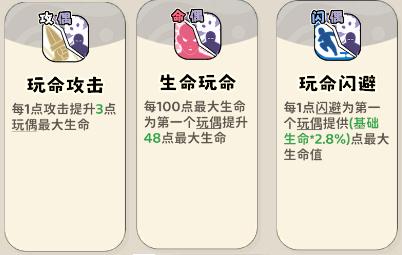 (3)提升玩偶属性技能,根据攻击、生命、闪避提升玩偶生命。承伤类玩偶流可点满,不承伤不点。