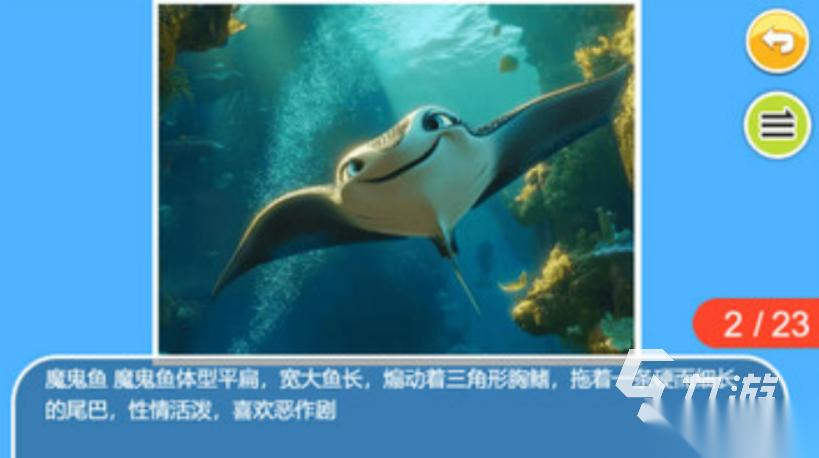 屏幕上全是蓝色的海水,有好多小鱼游来游去,比如小金鱼、小丑鱼。宝宝点一下小鱼,小鱼会停下来摆摆尾巴,还会吐出小泡泡。还能给小鱼喂食物,点一下食物图标,小鱼就会游过来吃。宝宝有时候会盯着小鱼看很久,好像在跟小鱼玩,能认识不同的小鱼。