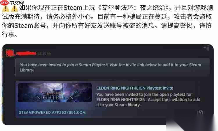 长期以来,Steam平台的私信和聊天系统被广泛用于诈骗活动。不法分子常伪装成游戏测试员、战队管理人员或玩家,尤其在《反恐精英2》社区中频繁作案,发送诸如“这是送你的礼物”或“我是某某战队邀请你加入”之类的信息,并附带诱导性链接,导致大量用户账号被盗、库存物品被转移。此外,在单机游戏领域,也出现了假冒《深海迷航2》或根本不存在的《艾尔登法环:黑夜君临》网络测试中奖通知等骗局。