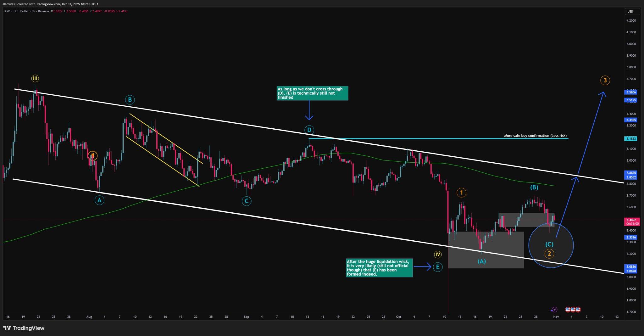 值得注意的是,10 月 13 日 XRP 价格回升至 2.64 美元标志着第一浪的结束,而 10 月 17 日下跌至 2.29 美元则构成了 ABC 调整浪的 A 浪。此后,XRP 于 10 月 27 日反弹至 2.69 美元,完成了 B 浪。自那以后,XRP已经开始再次回落,这与 DustyBC 预期的最后一次下跌相符。