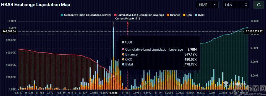 从仓位分布来看,目前空头占据主导地位,并且投资者普遍认为HBAR价格不会突破0.1972美元。