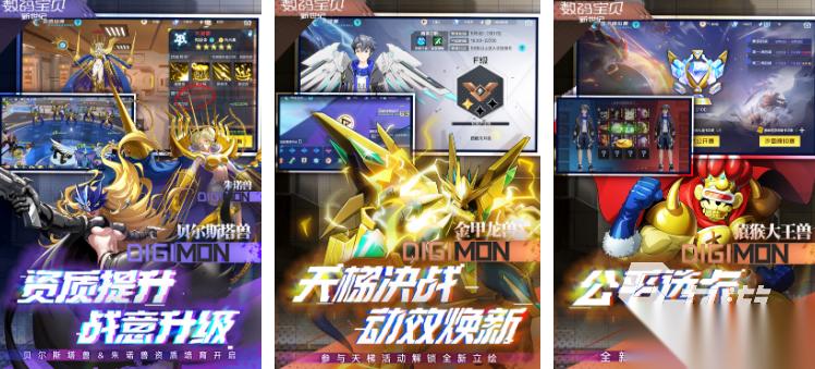 数码宝贝:新世纪作为正版授权手游,将数码宝贝的收集、养成与战斗完美融合,唤醒玩家的童年记忆,游戏收录了众多经典数码宝贝,从成长期的亚古兽、加布兽,到成熟期的暴龙兽、加鲁鲁兽,每个数码宝贝都有独特的外观、属性与技能,玩家可通过招募、副本掉落等方式获取数码宝贝。