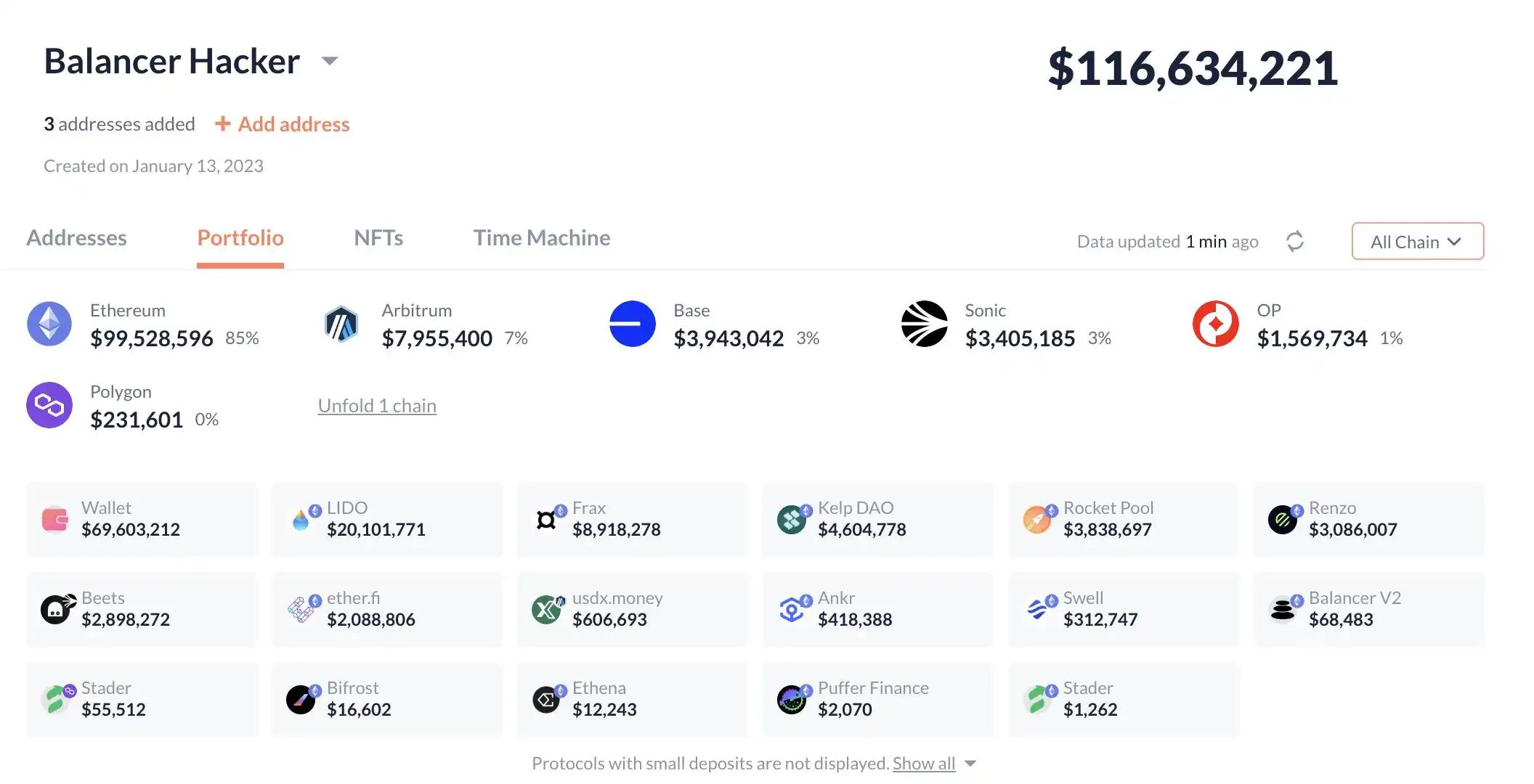 根据链上信息,Balancer 攻击者目前盗取资金规模已突破 1.16 亿美元,主要被盗资产包括 WETH、wstETH、osETH、frxETH、rsETH、rETH,分布在 ETH、Base、Sonic 等多条链上,其中: