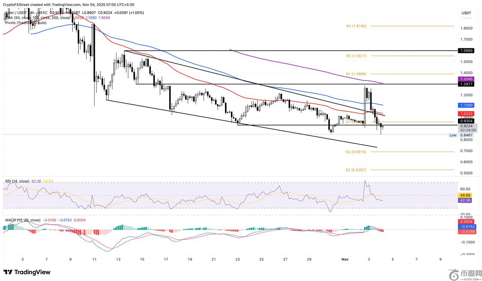 相对强弱指数 (RSI) 为 42,徘徊在中间点和超卖区域之间,表明市场呈下跌趋势。