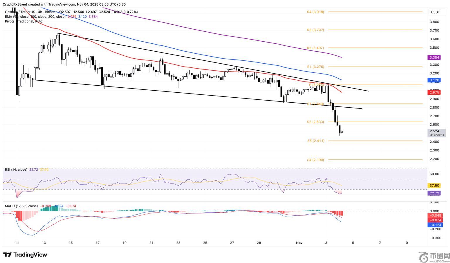 截至周二发稿时,Cosmos 股价守住了 2.500 美元的水平,目标价位是 2.411 美元的 S3 枢轴点。4 小时图上 50 周期、100 周期和 200 周期指数移动平均线 (EMA) 的下降趋势表明,目前处于下跌趋势。