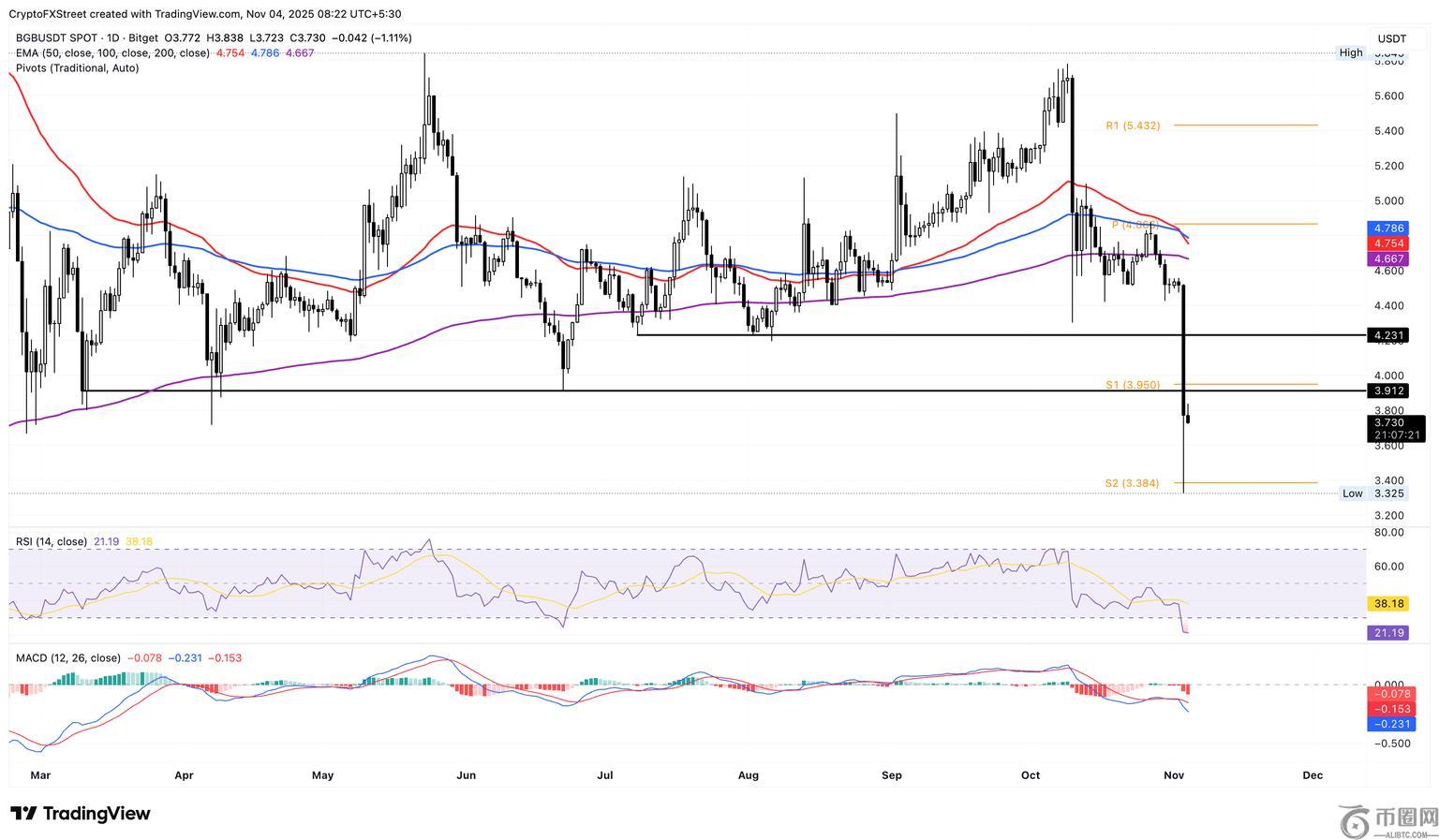 截至周二发稿时,Bitget 下跌 1%,延续了前一日 16% 的跌幅。该中心化交易所 (CEX) 代币交易价格低于 4 美元,卖方目标价位为 3.384 美元的 S2 枢轴点。