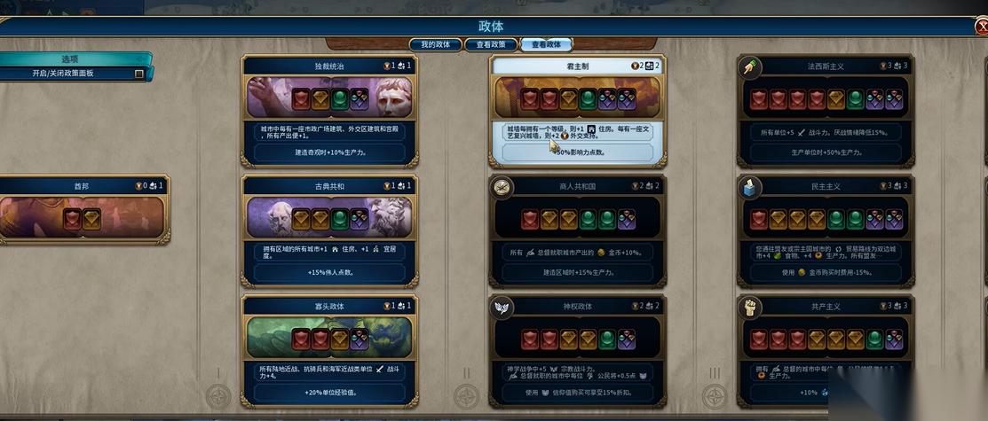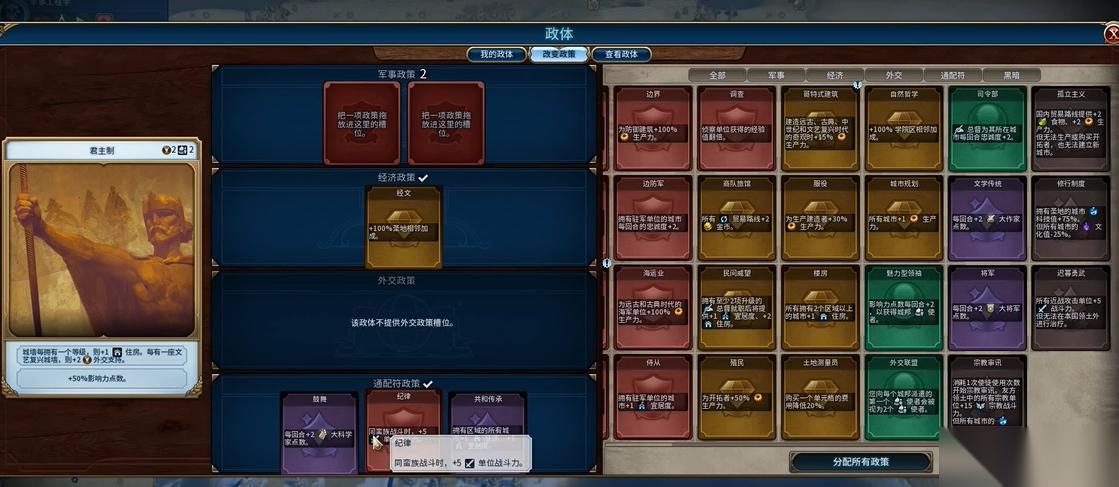 拿到寡头传承卡后,记得检查政策槽位是否够用。这张卡需要放在军事槽里才能生效,如果槽位被其他政策占满了就尴尬了。建议在切换政体前先把不必要的政策卡换下来,给寡头传承卡腾位置。特别是在准备打仗的时候,这4点战斗力加成还是挺关键的。如果后面换了其他政体但继续挂着寡头传承卡,近战单位依然能享受加成。注意高级政体的传承卡可能更适合后期发展,到时候可以根据实际情况决定是否更换。