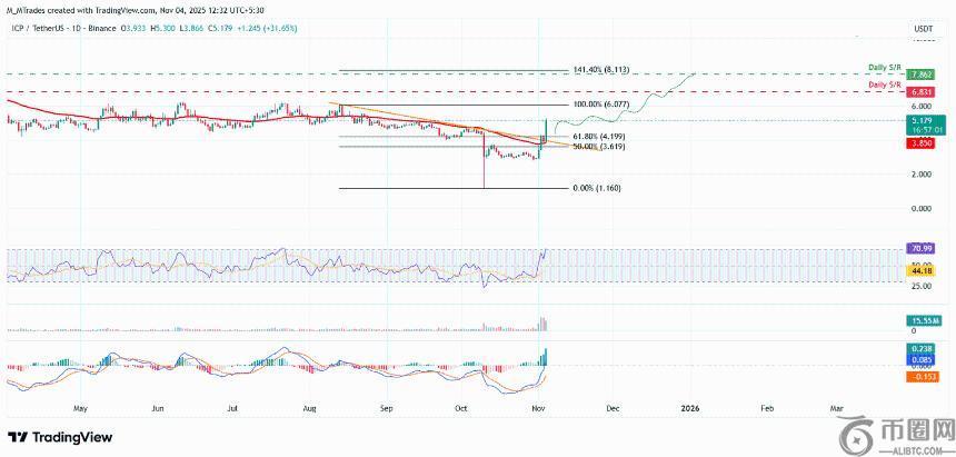 若ICP继续保持上涨势头,则有望挑战6.83美元的日线阻力位。