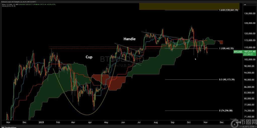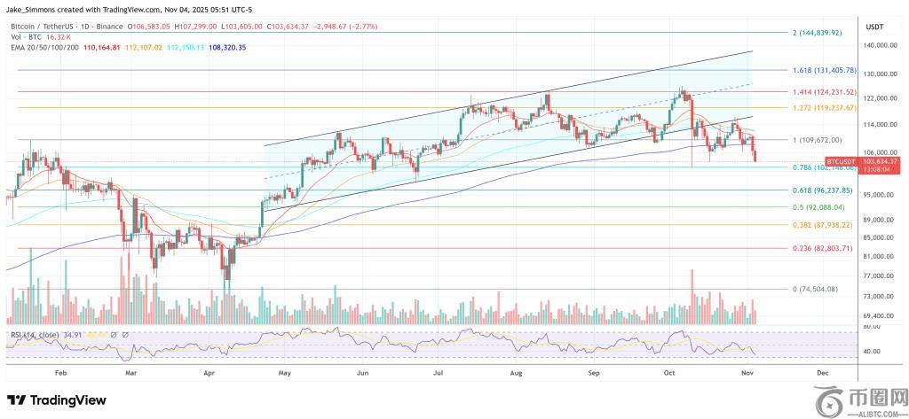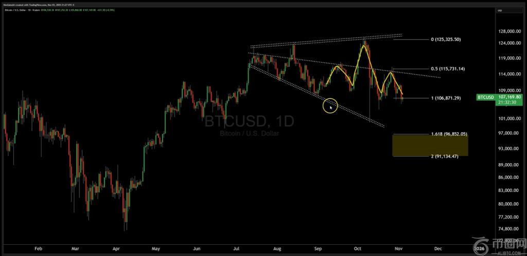 对于比特币,他指出了一系列看跌信号:周线图上的看跌迟行跨度、移动平均线向下交叉,以及大小周期上的头肩顶形态。尽管他承认可能存在“下降通道”,甚至……更宽泛的“扩音器”这可能会使模式解读变得复杂,奥尔谢维奇强调了近期方向性风险:“如果我随机醒来发现价格在 103,000 美元、102,000 美元,我不会感到惊讶,”甚至警告说,“我们有可能跌破 100,000 美元。”